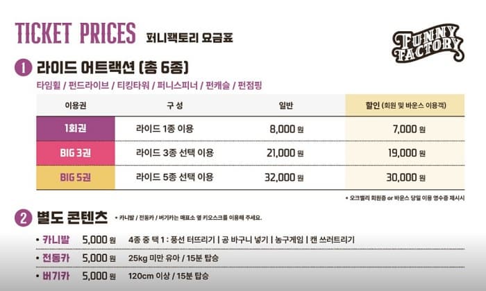 퍼니팩토리 공식 SNS 또는 오크밸리 홈페이지에서 제공하는 쿠폰을 활용하면 입장료나 자유이용권에 추가 할인 혜택을 받을 수 있으니 꼭 확인해 보세요!
